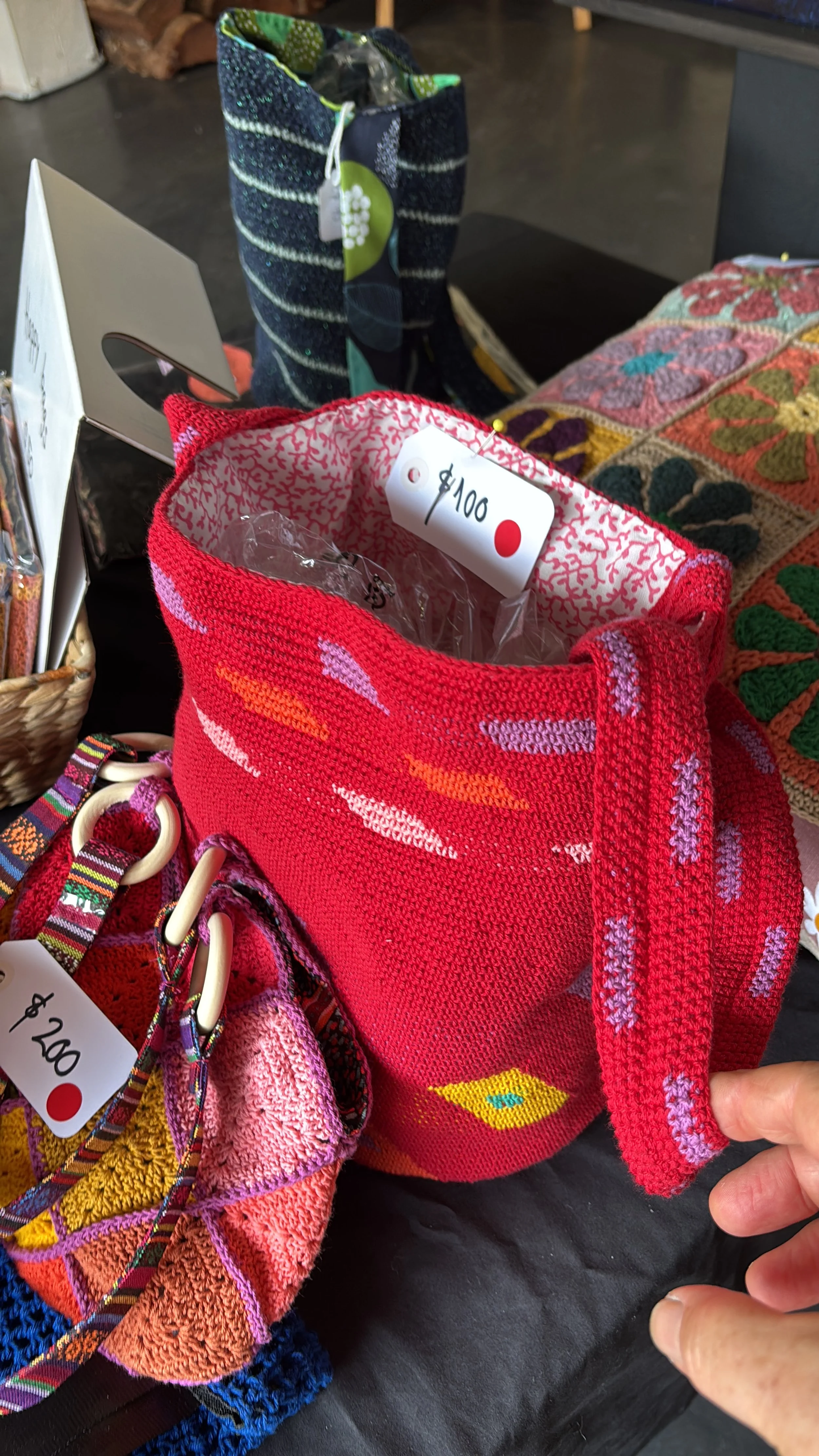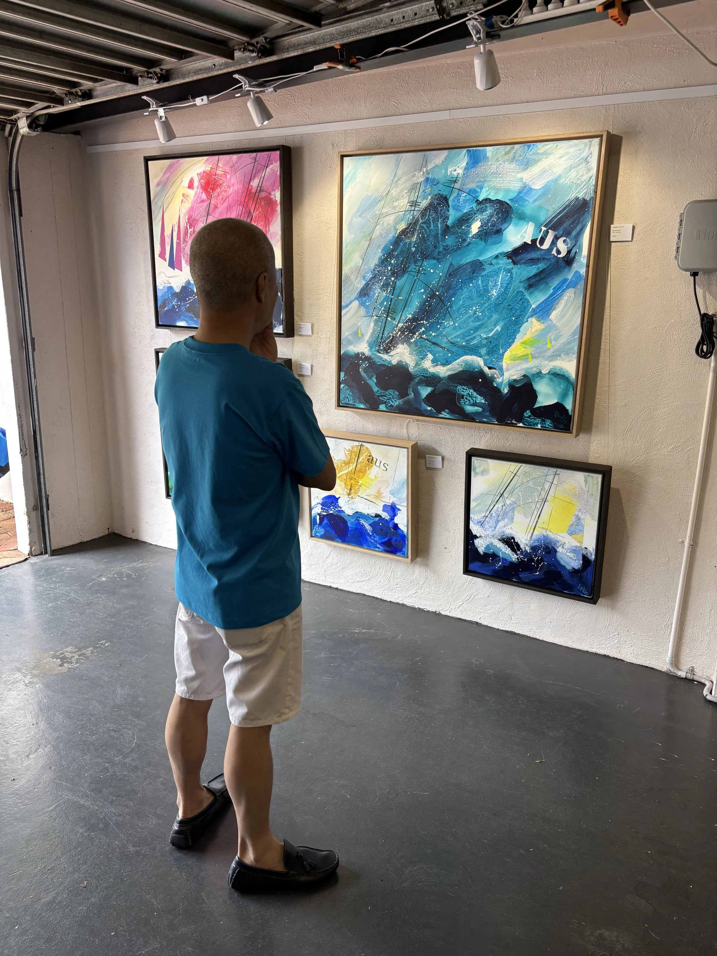 Every year the more than 36 Greenwich artists open their studios for the wider community and the streets of our little suburb fill up with families and enthusiastic art lovers. I love that time of year when spring is in the air, the purple jacaranda is in full flower and people come around to look and purchase my art. Whilst I am on the boat I can’t paint so I design and create little crochet unique bags. The sales from those bags go to a charity that support victims of domestic violence Mary’s House.